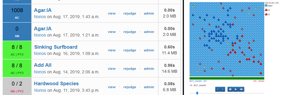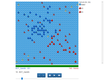 • AI competitions. The final of the Prologin contest is a tournament between programs developed to play a game designed for the occasion. I implemented a functionnality that allows users to upload and compile their program on the website, and make it compete against other players. A visualiser also allows them to understand better the behavior of their AI and the opponent's one.